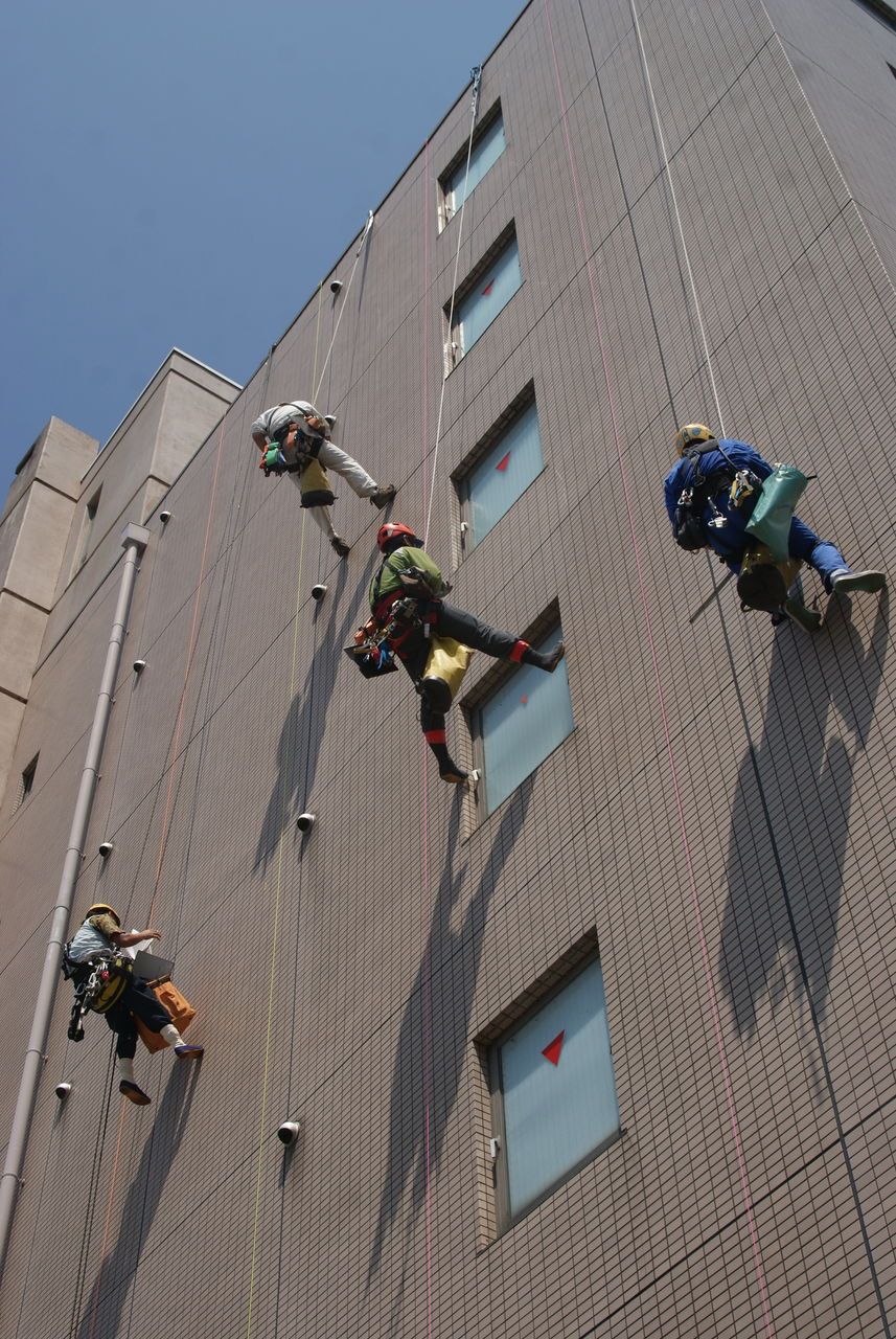 作業前にはリスク評価を行い、適切な作業計画を策定したうえで施工を実施します。また、使用するロープや器具は日常点検および定期管理を徹底し、万が一に備えた救助手順や訓練も行っています。