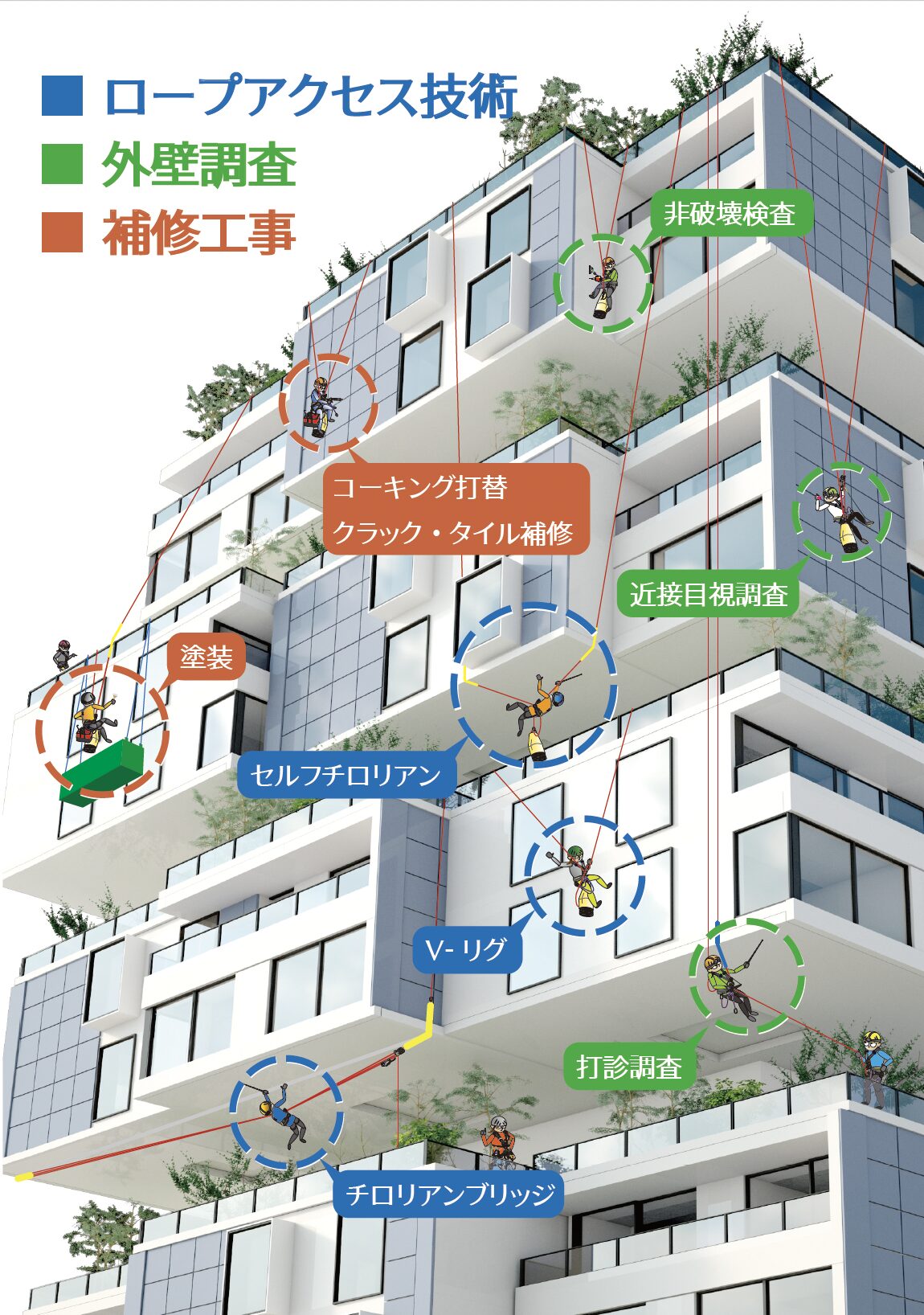 外壁調査・外壁補修において、ロープアクセスは効率的で有効な手法です。