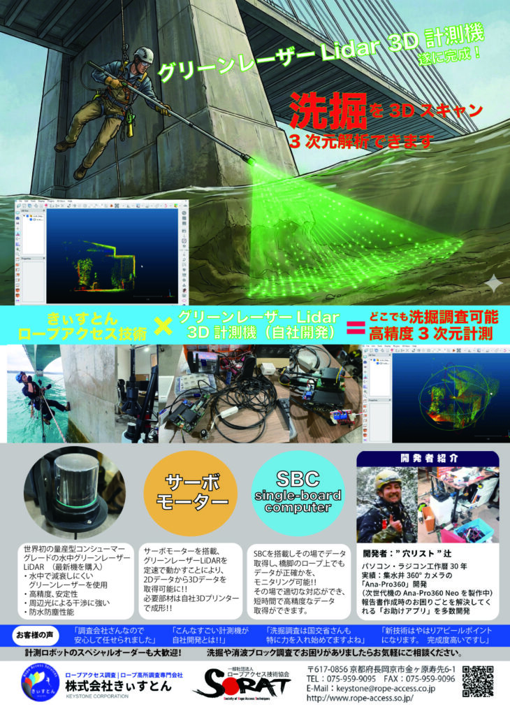 株式会社きぃすとんでは、グリーンレーザーLiDARを用いた3D計測機を自社開発し、橋梁周辺の洗掘調査やインフラ点検における高精度な三次元計測を可能としました。