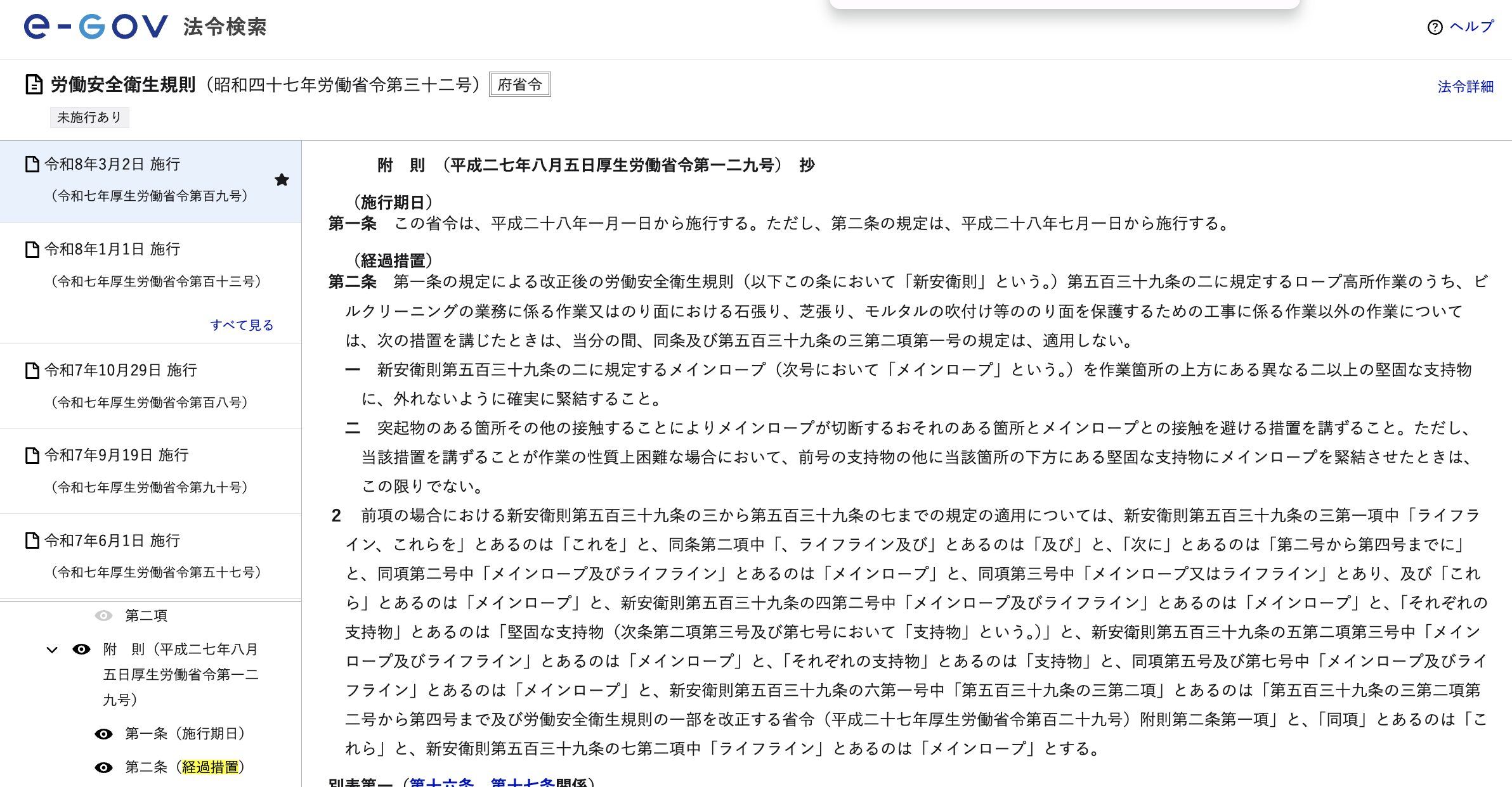 そして、この技術は決して法律違反などではなく、 日本の法律(労働安全衛生規則)に、一定条件を満たした場合の1本ロープ使用が明記されており、SORATはその条件に準拠しています。