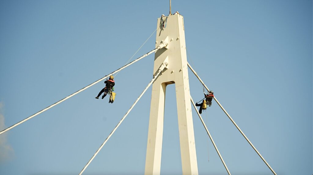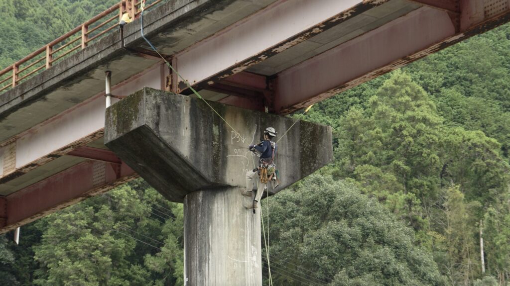 私たちは、決して他のロープアクセス技術を否定しているのではありません。垂直方向のアクセス作業において、2本ロープ方式は優れています。しかし日本のインフラ点検は、それとは異なる課題を抱えた現場です。