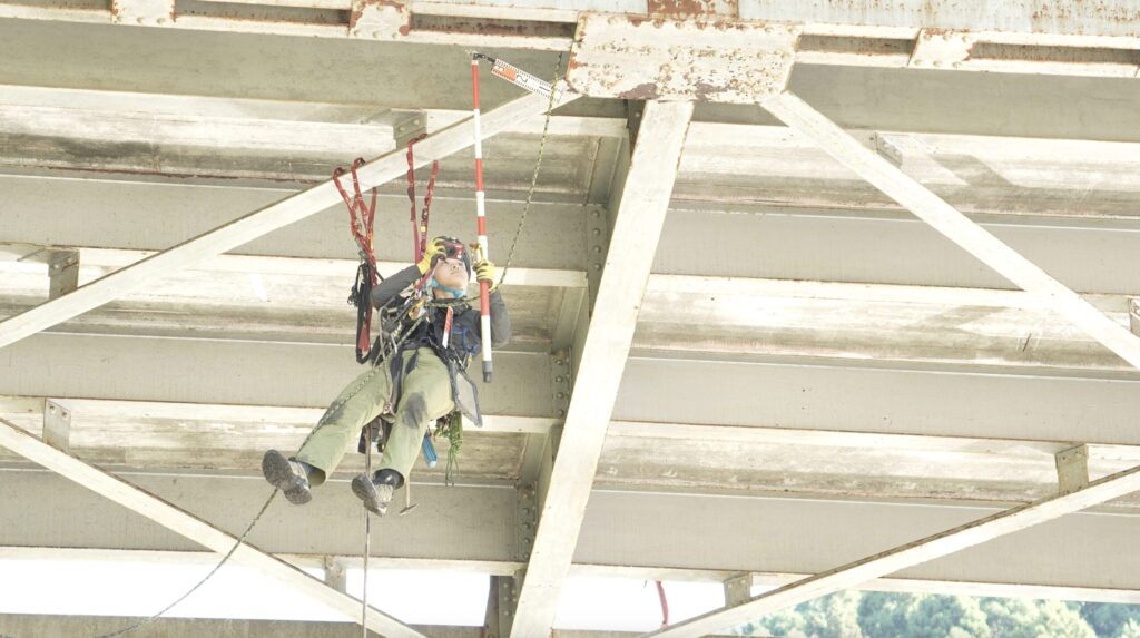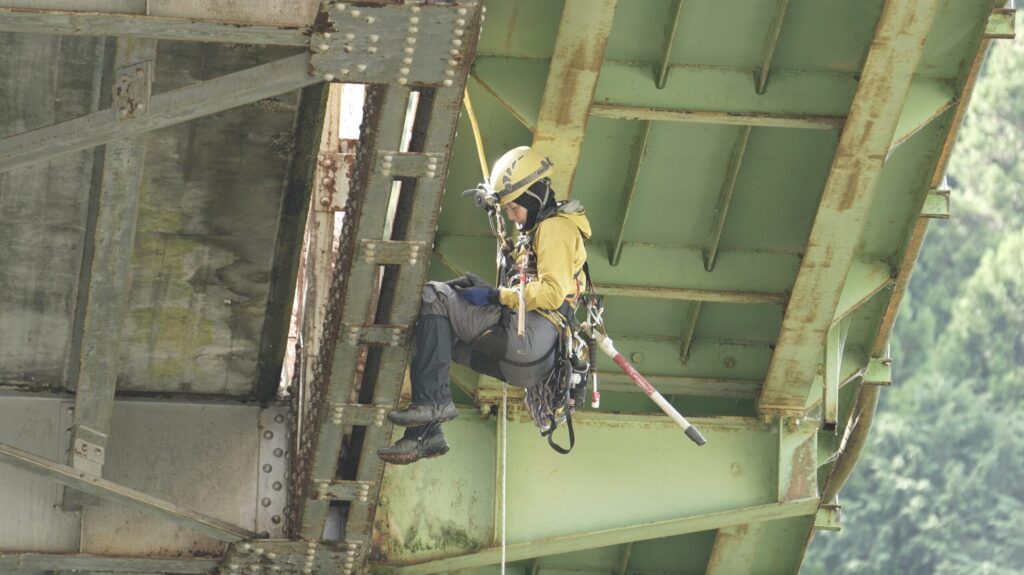 日本の橋梁の裏側、耐震構造物が密集し、縦・横・斜めと複雑に入り組んだ空間での3次元移動において、ロープと固定点の管理が複雑になればなるほど、ヒューマンエラーのリスクが高まるという現実です。
